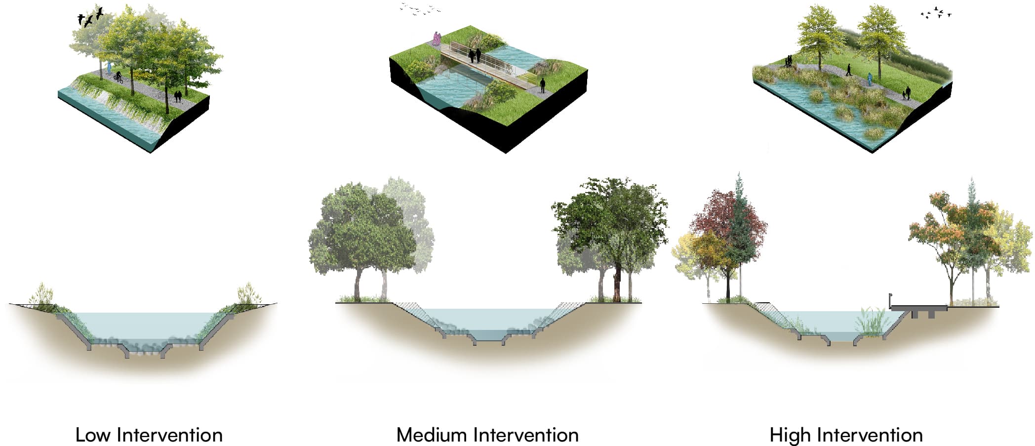 Interventions are staged at different intensities. From minimal enhancements to full ecological restructuring. Making the design flexible to budget, phasing, and technical demands. Together, these moves turn a utilitarian canal into a civic landscape that performs as both stormwater infrastructure and a daily public space.