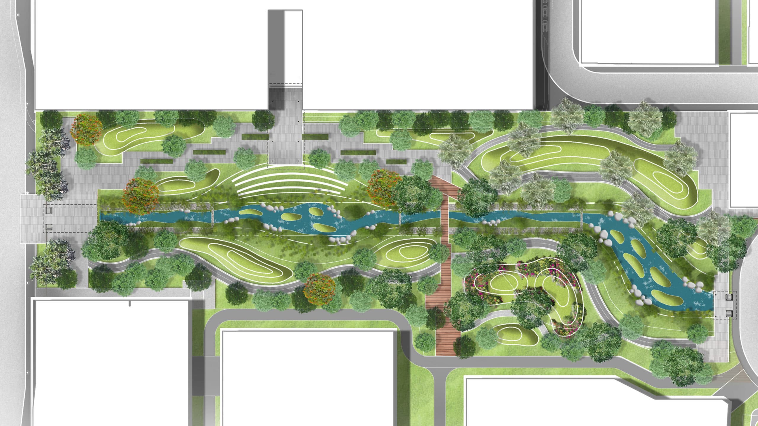 Rather than treating the canal as a hidden utility, the design embraces it as the spine of a new linear park. Guided by water-sensitive design, the plan introduces riparian buffers, wetlands, and soft planting edges to filter flows and expand habitat. Four key zones anchor the corridor with distinct identities and functions. Pathways, decks, and shaded gathering spaces invite people to engage with the water, while layered planting ensures resilience across seasonal changes.