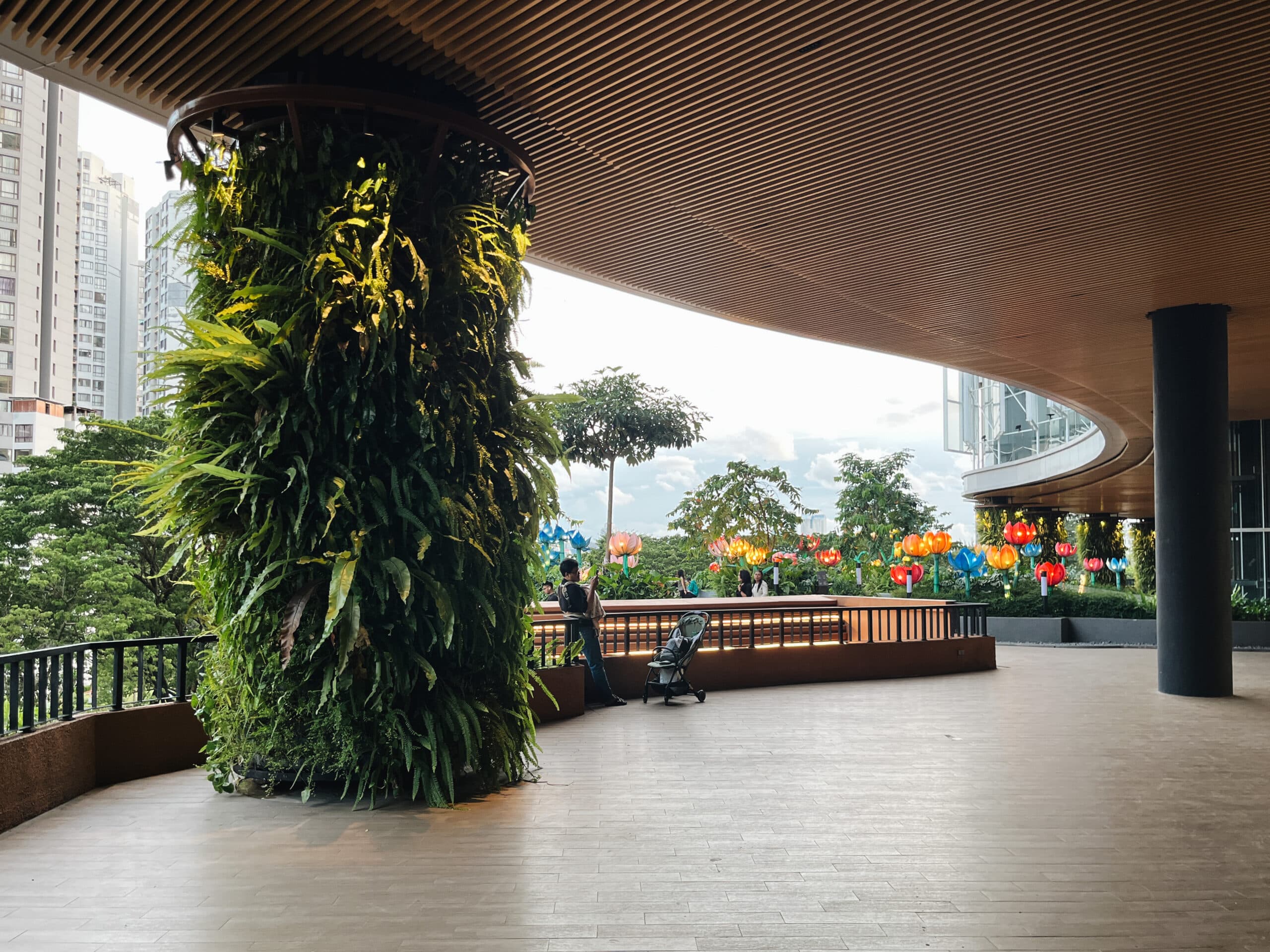 Cascading greenery softens the multi-level facade, transforming the retail complex into a vertical garden.