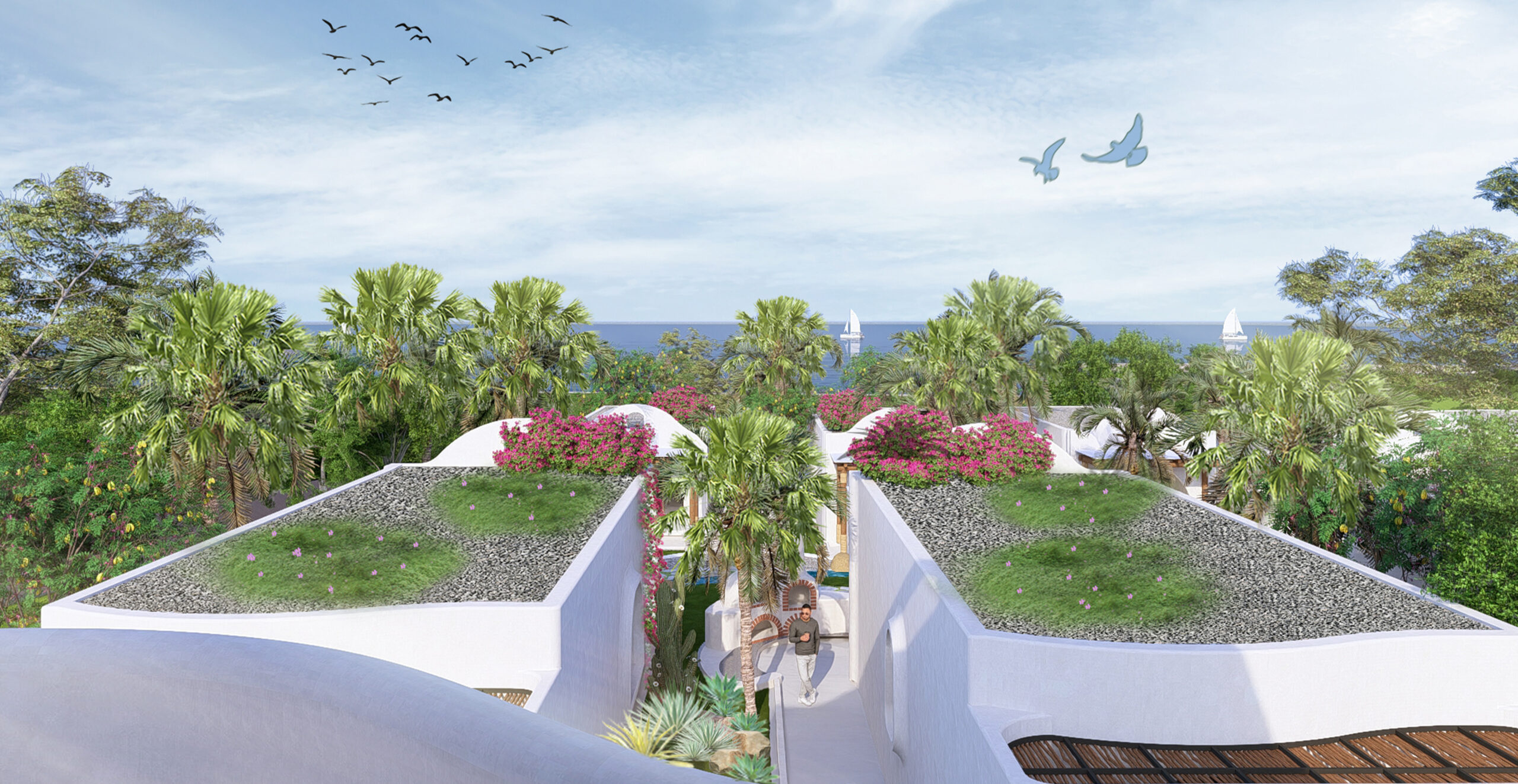The forest courtyard were divided into 3 section with pond as anchor that seamlessly connect to the lagoon while the swimming pool provide a relaxing space to calm. A cascading pond beside the pools captures and recycles rainfall, forming a reflective link between leisure and ecology. Around it, lush planting connects the pools and ponds into one continuous green framework. Native species thrive across courtyards and façades, shaping a breathable resort that feels alive and ever-cooling.