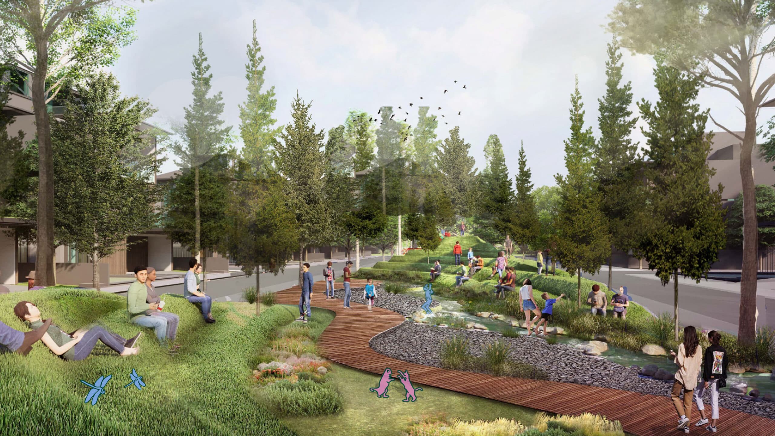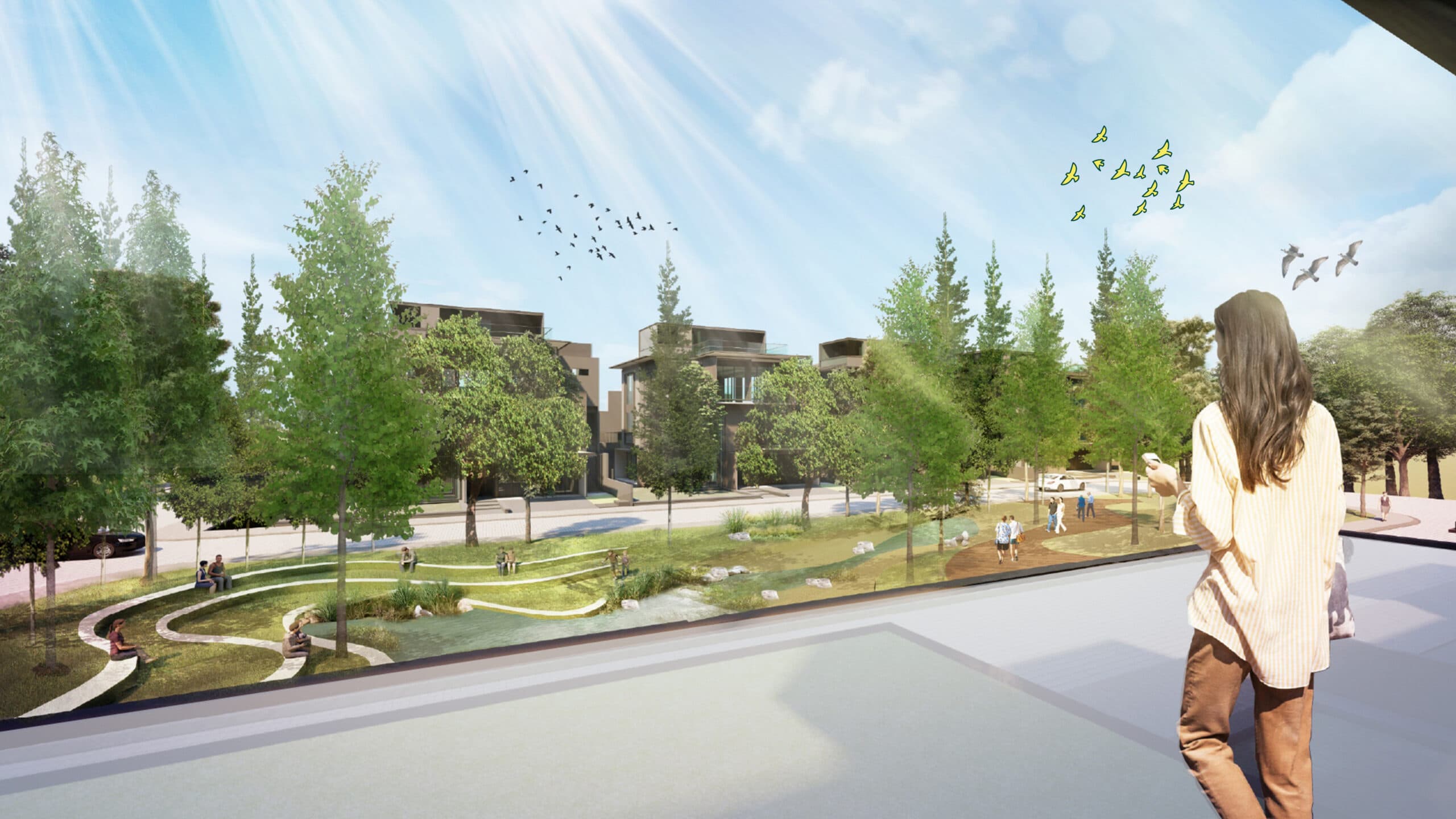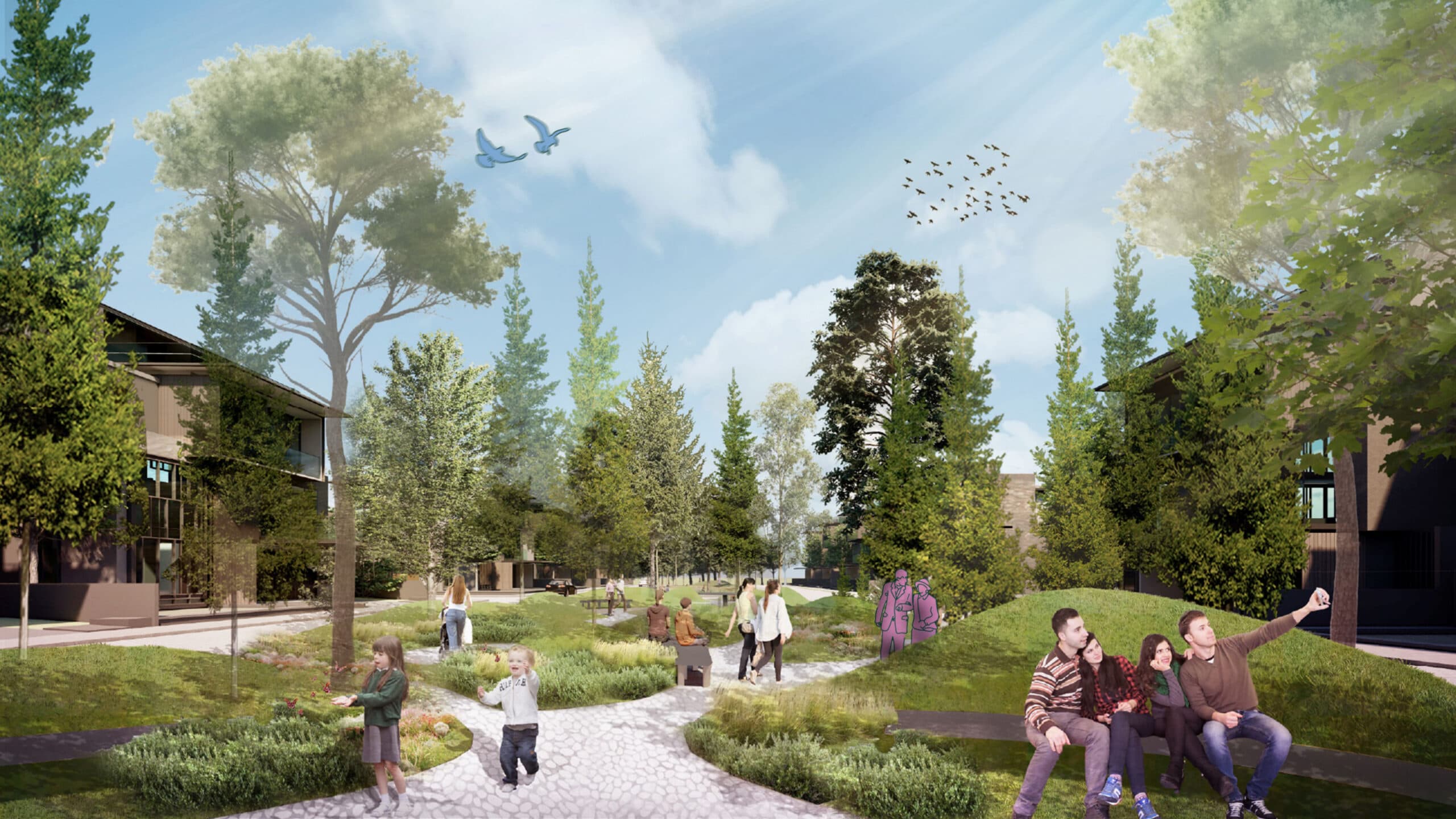 The concept unfolds through a Garden of Four Seasons, where nature becomes a living canvas for daily life. Each zone expresses a distinct character: the Summer Terrace welcomes with open gardens and courtyards; the Autumn Meadow gathers warmth through pavilions and soft-toned trees; the River Theatre overlooks the water in calm reflection; and the Spring Garden blooms with color and light. A network of green belts, boulevards, and nodes ties the neighborhood together, creating spaces for play, leisure, and friendship. Through its sensory journey, color, scent, texture, Layton invites residents to live within the rhythm of changing seasons, where landscape and life gently intertwine.