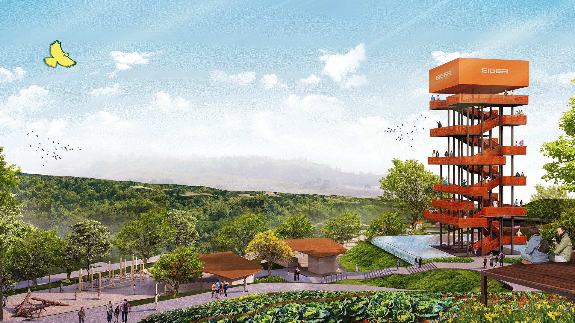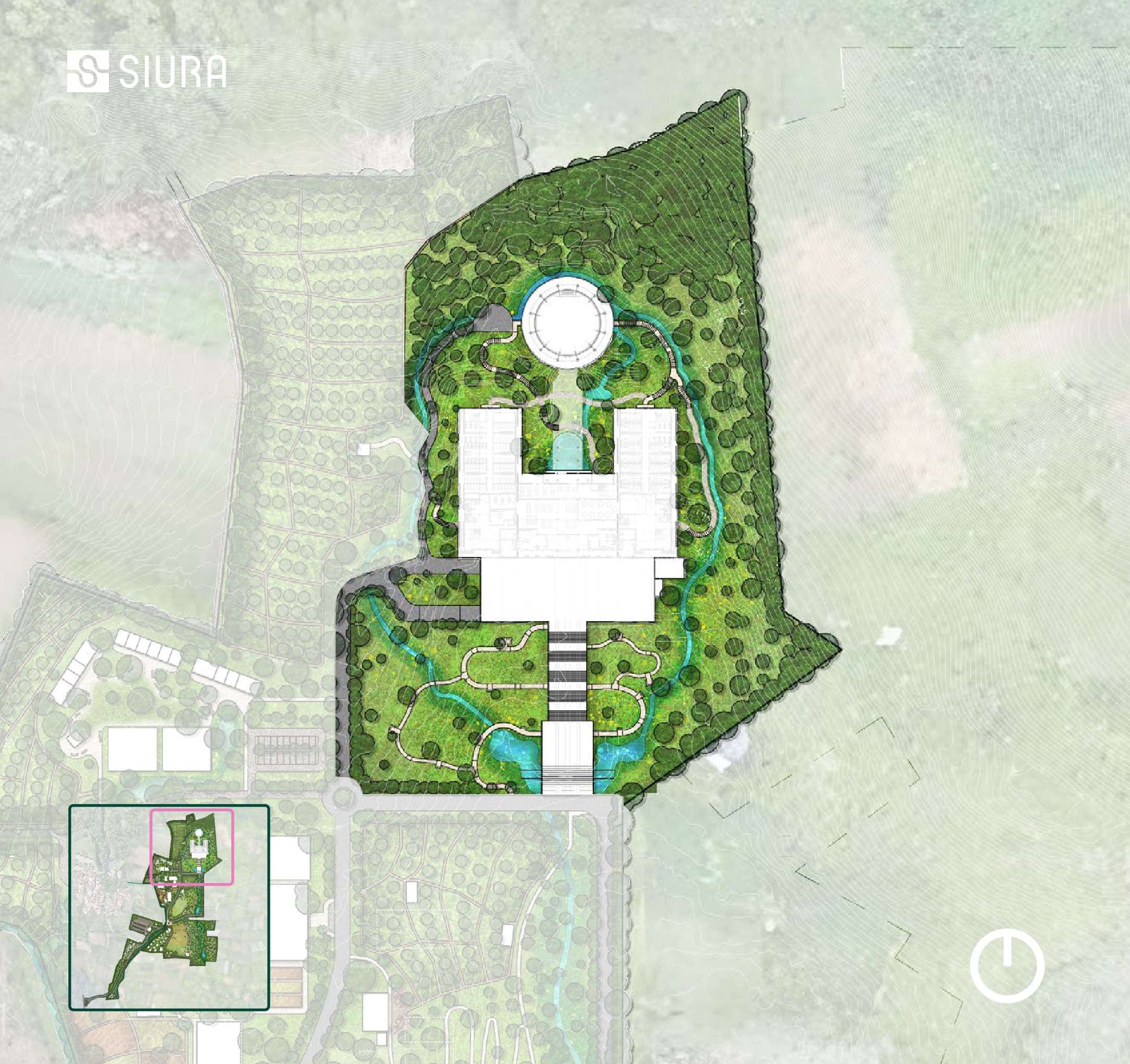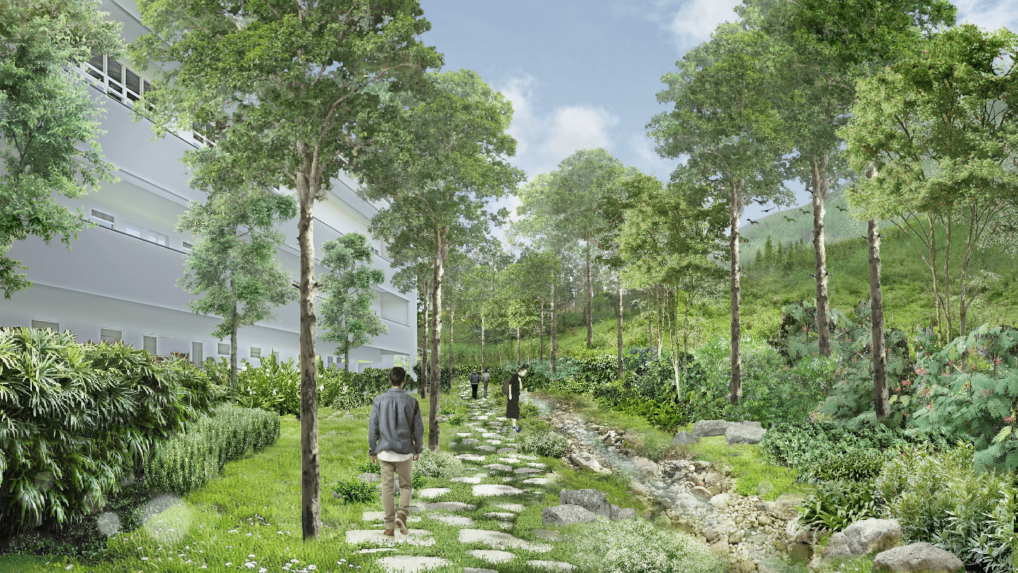 The five-storey building sits within a steep, contoured highland landscape, presenting challenges related to solar exposure, slope stability, and water runoff. Large building massing required careful landscape mediation to maintain thermal comfort and visual harmony with the surrounding terrain. Existing protected forest areas merge directly with parts of the pavilion, demanding a sensitive approach that strengthens, rather than disrupts, the relationship between built form and natural systems. Water management became a critical design driver. Steep contours increase runoff and erosion risk, requiring integrated strategies such as natural swales and retention lakes to slow water flow, protect slopes, and enrich biodiversity. At the same time, the landscape needed to support contemplative spatial experiences, leveraging panoramic views, natural elevation changes, and forest edges to shape moments of pause and reflection.