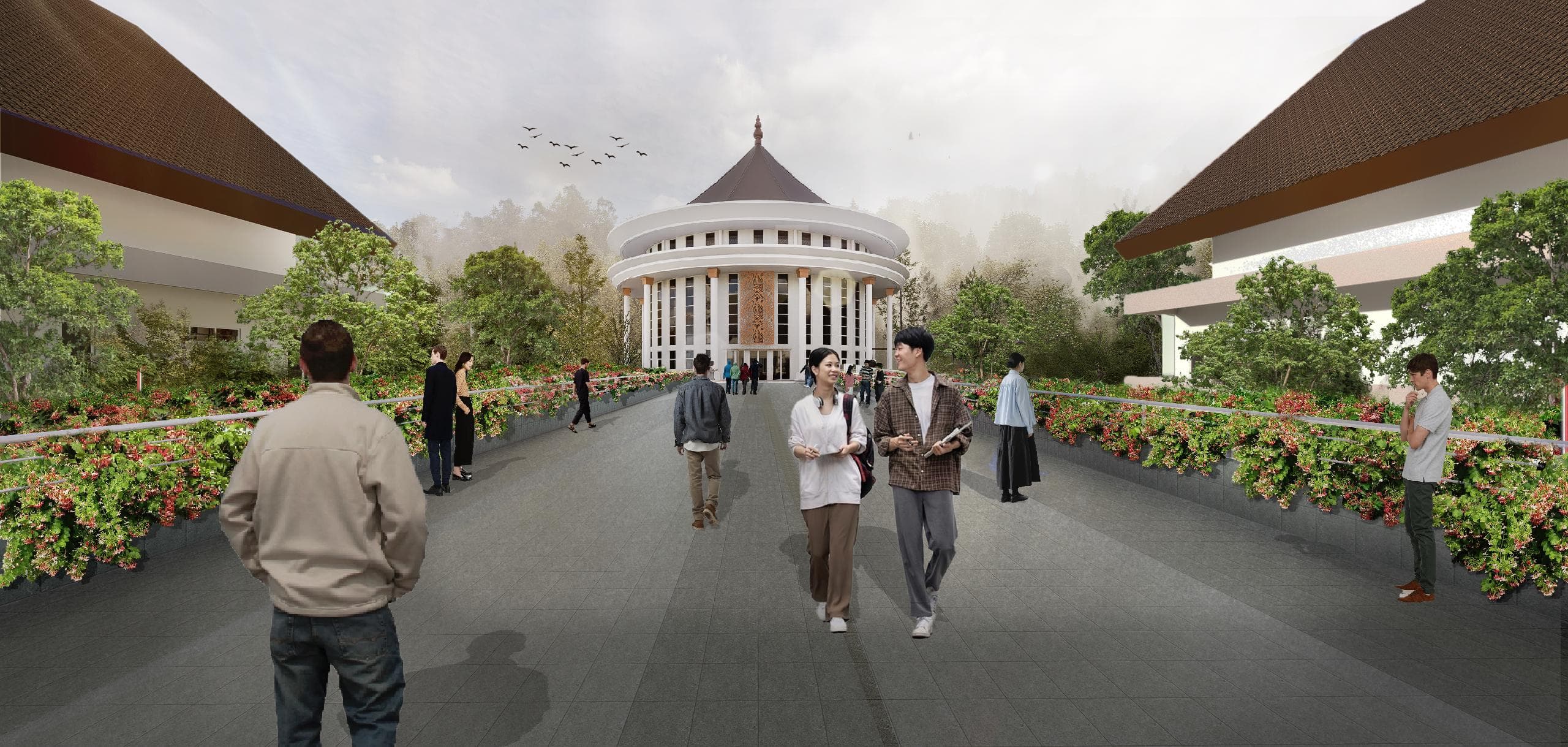 Bridges connecting the pavilion extend the experience vertically and horizontally, offering immersive views both above and below the landscape. Through this integrated approach, Mandatalam Building becomes a place where architecture and landscape work together as a contemplative, regenerative environment: supporting inner peace, ecological health, and collective well-being.