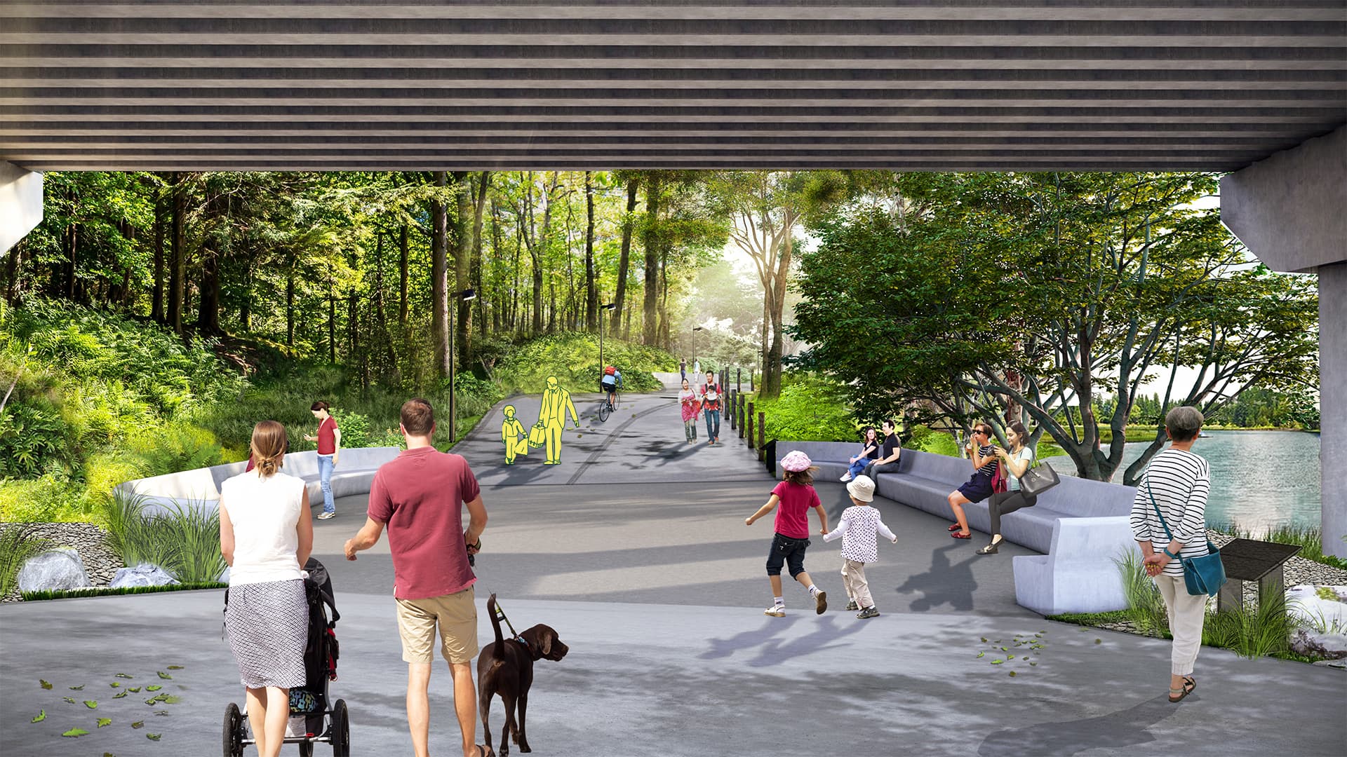 The design organizes the riverside into a continuous park system that threads through the development, binding built edge and riparian forest. Trails follow natural contours; viewing decks hover just above flood lines; bioswales capture and filter surface water before it meets the stream. Each intervention is measured with minimal cut, maximum connection, creating a landscape where structure yields to soil and water. What was once inaccessible now becomes an unfolding terrain of movement, light, and restoration.
