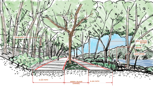 The landscape is designed as a continuous, shared promenade, stitched into the hillside without large-scale cutting or infill, and shaped around nature rather than imposed upon it