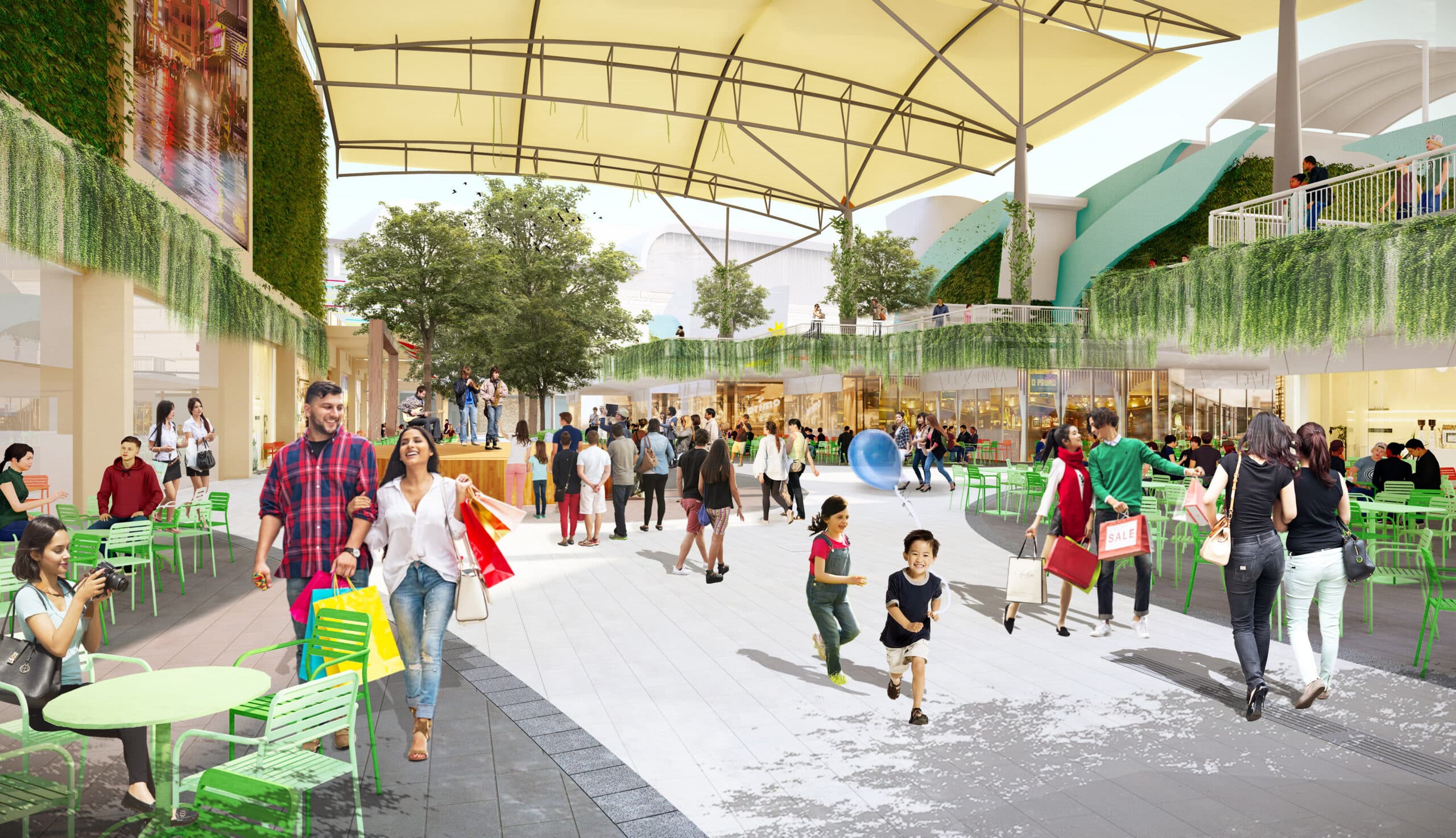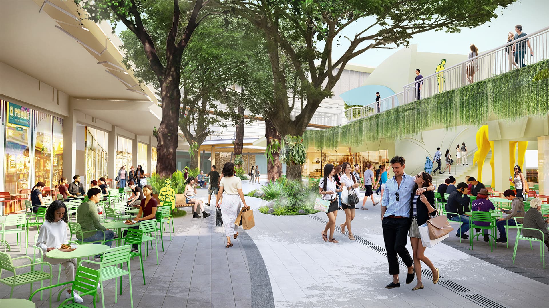 The design reimagines a typical mall frontage as a vibrant public space shaped by nature