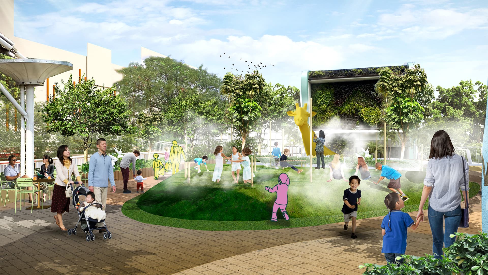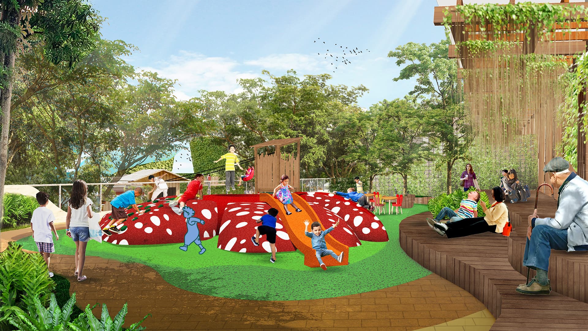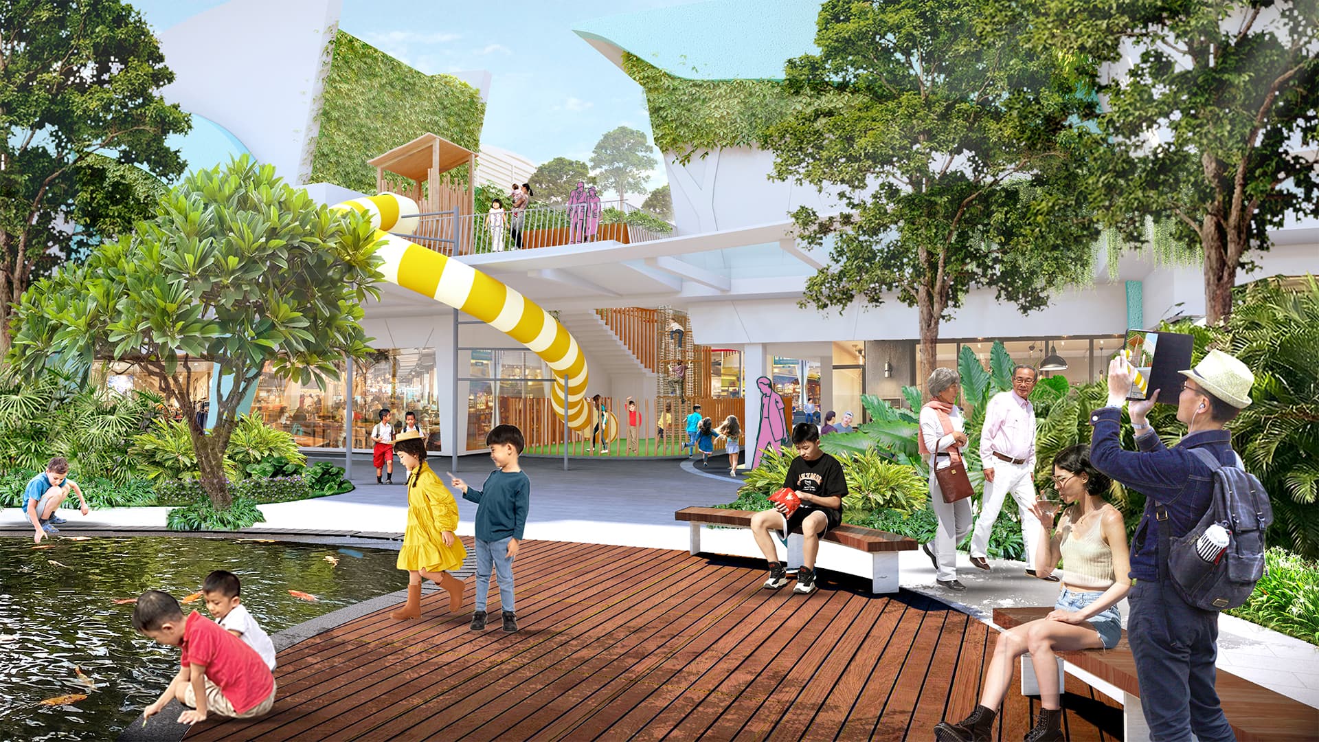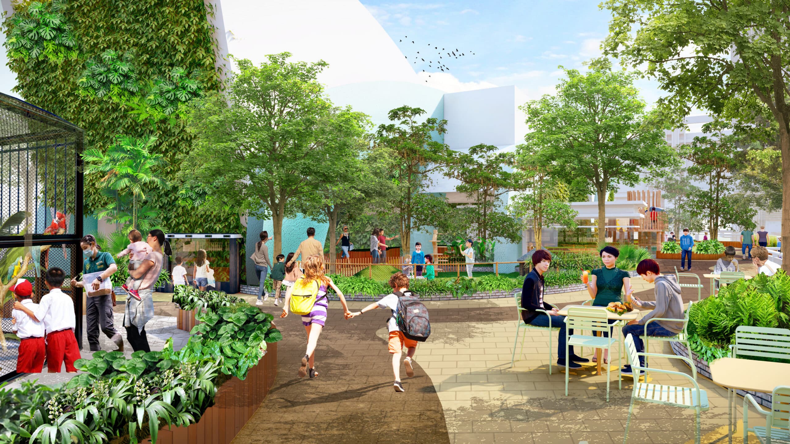 Four main landscape zones: Forest Walk, Valley Square, Eco Stream Walk, and Sky Jungle, guide the experience across ground and rooftop levels. At street level, a shaded path weaves together lush planting with flexible spaces for dining and activities. The plaza becomes a lively gathering spot with pop-ups and green walls. A water promenade brings the koi pond to life with fountains, boardwalks, and outdoor seating.