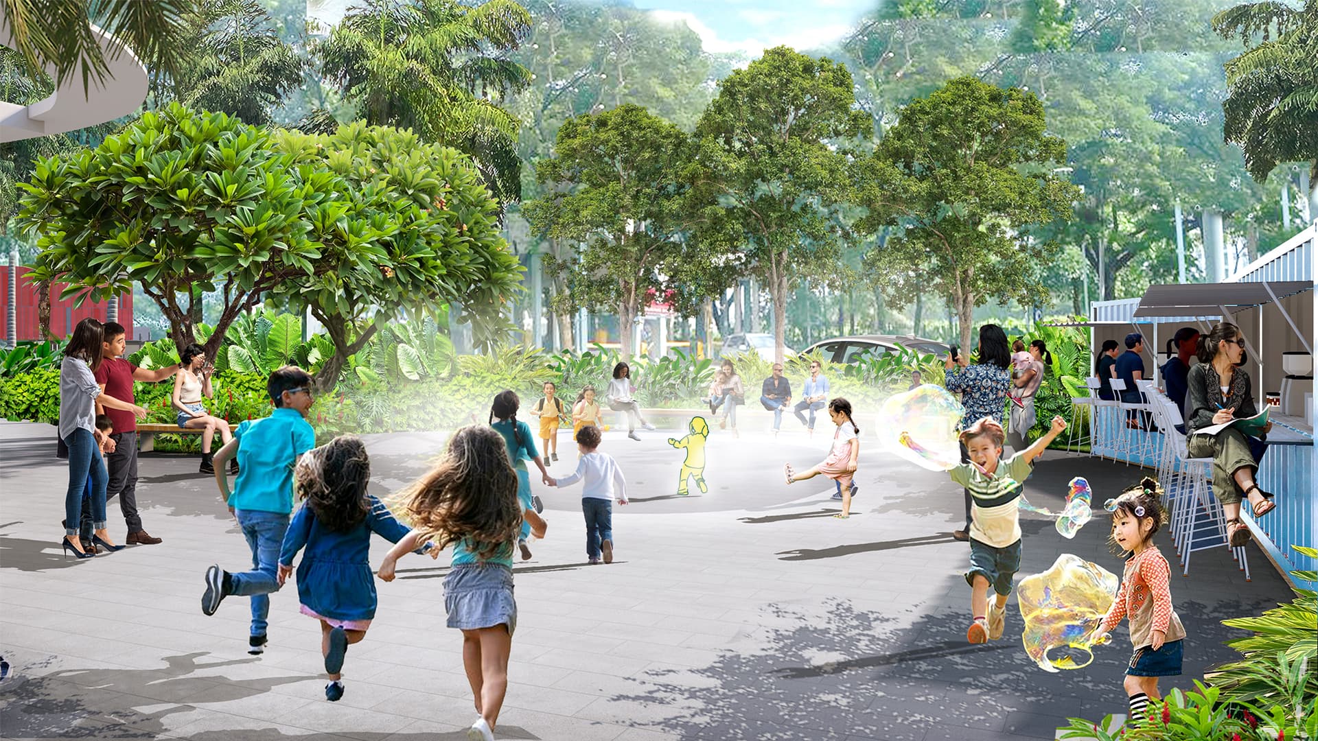 A neighborhood mall landscape reimagined for nature, play, and urban storytelling