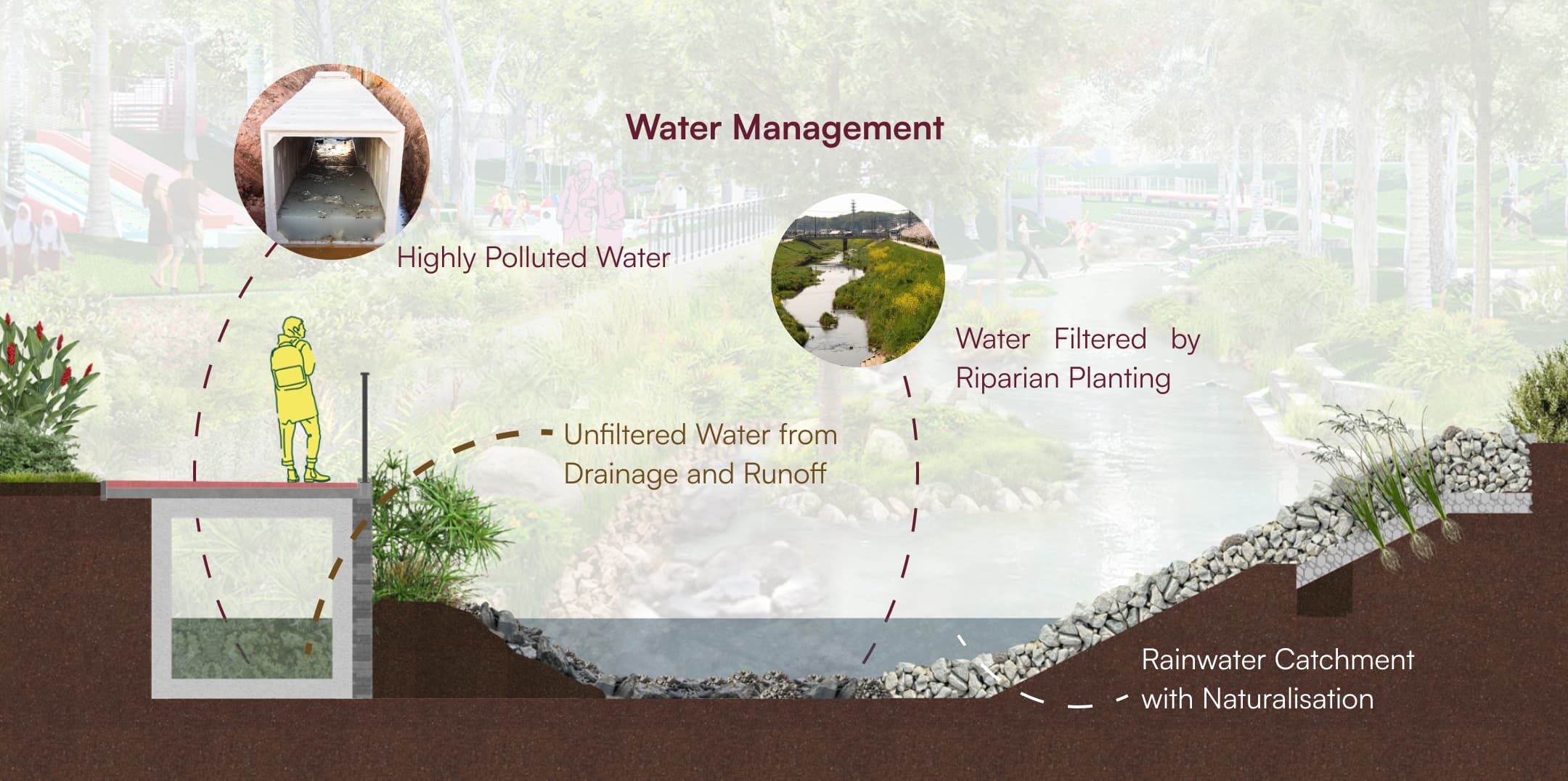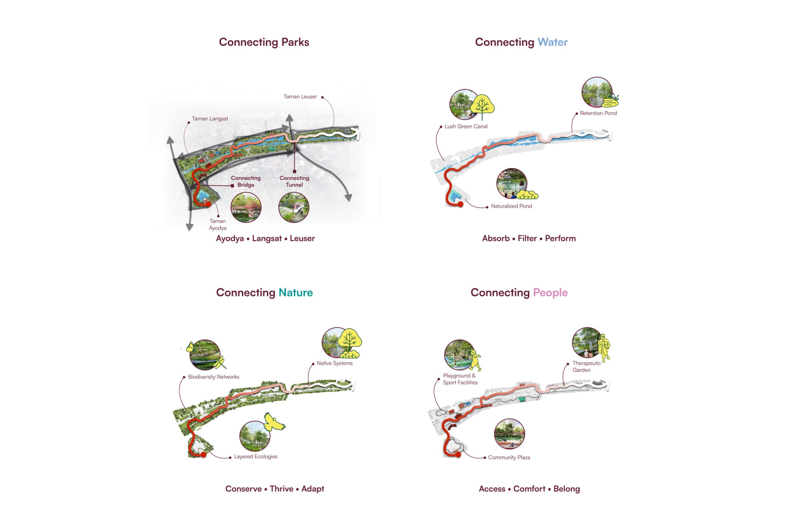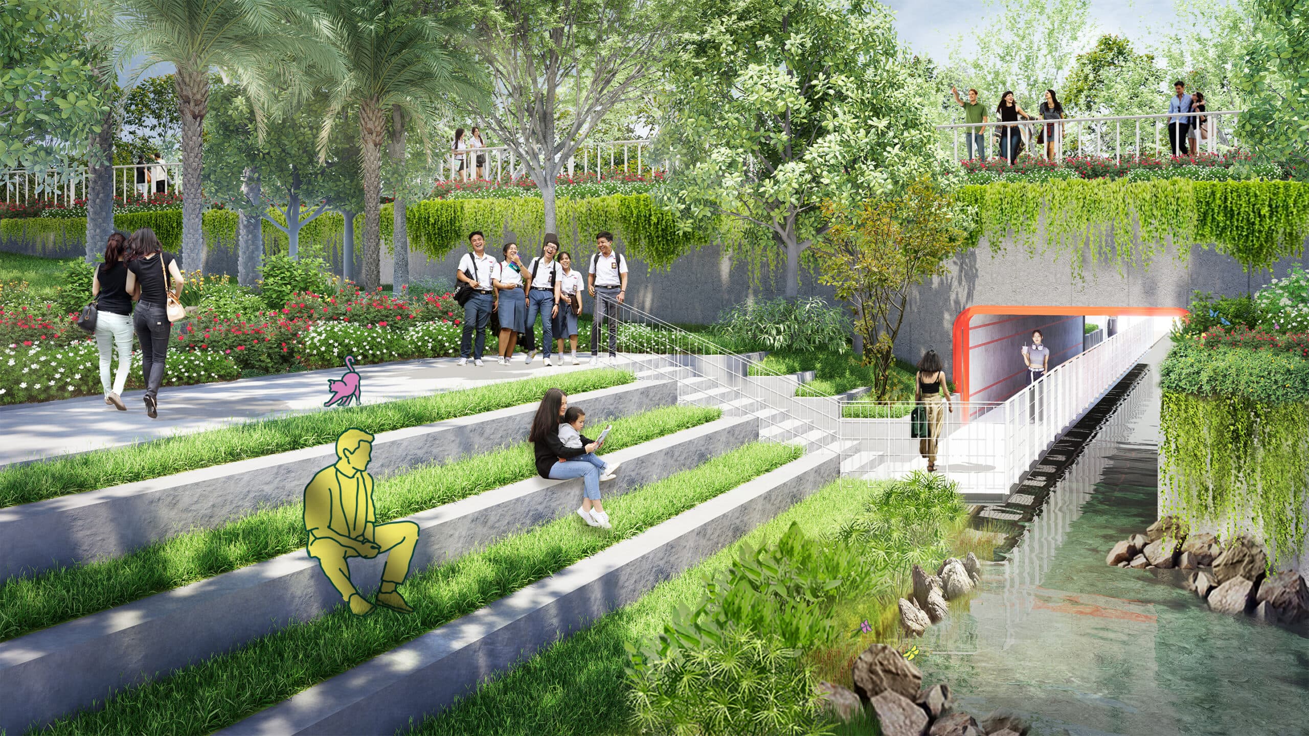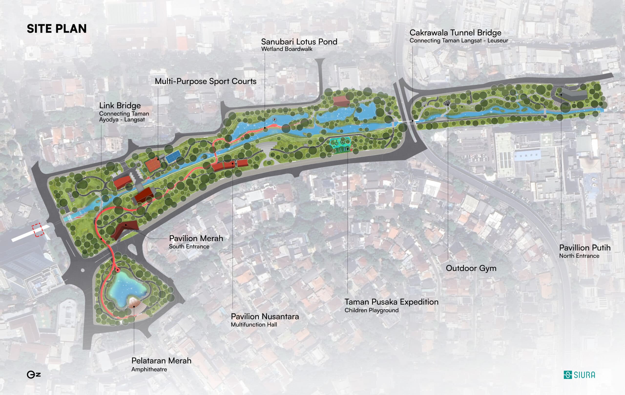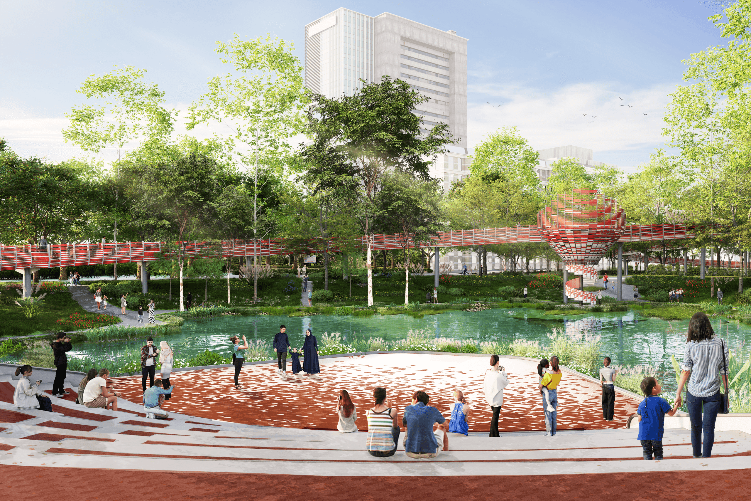 The design weaves ecology, accessibility, and national identity into one landscape narrative. A new sky bridge shaped and colored after the Indonesian flag, unites the three parks into a shared public realm. Canal naturalisation and wetlands transform old drainage lines into living water corridors, expanding floodplain capacity while restoring biodiversity.