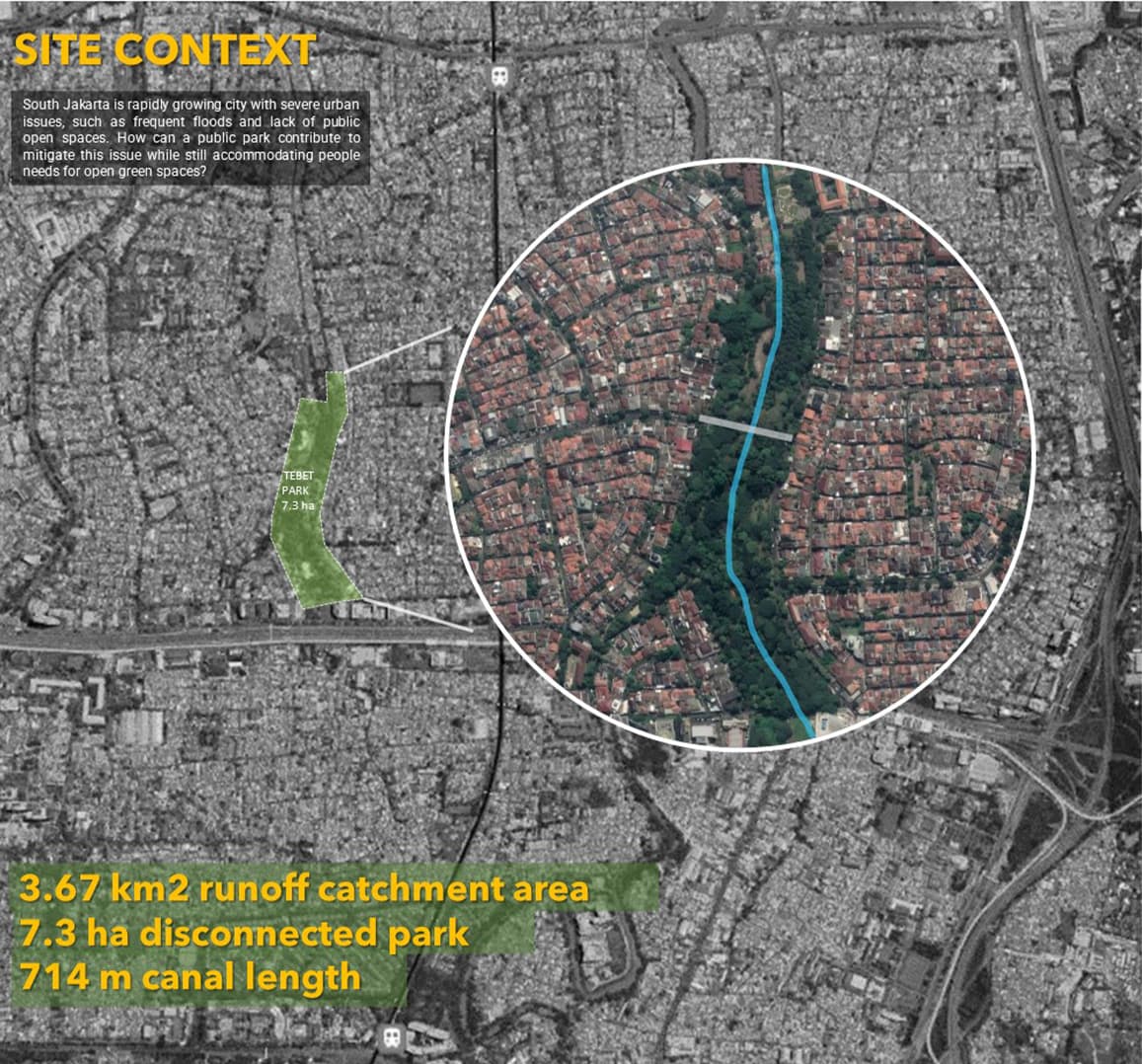 Before its transformation, the site of Tebet Eco Park comprised not one, but two disjointed parks known as Taman Seno and Taman Honda Tebet. This 7.3-hectare green space in Jakarta was fragmented by roads and a concrete canal, suffering from poor circulation and chronic seasonal flooding. Despite a canopy of mature trees, it was underused by the public, offering little ecological function or community connection.