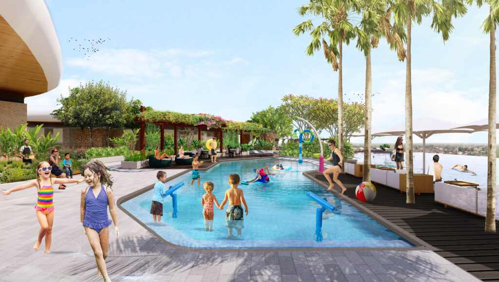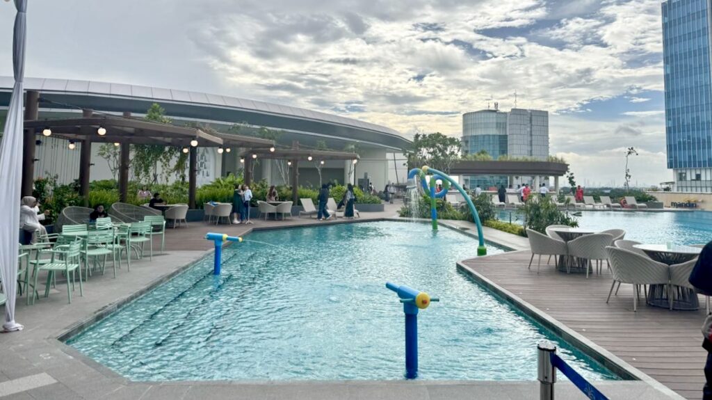 The design splits into two distinct energies: First, The Restorative Zone. Anchored by recreational pools, this area allows visitors to disengage from the city noise, offering a serene escape on top of Summarecon Mall Bekasi.