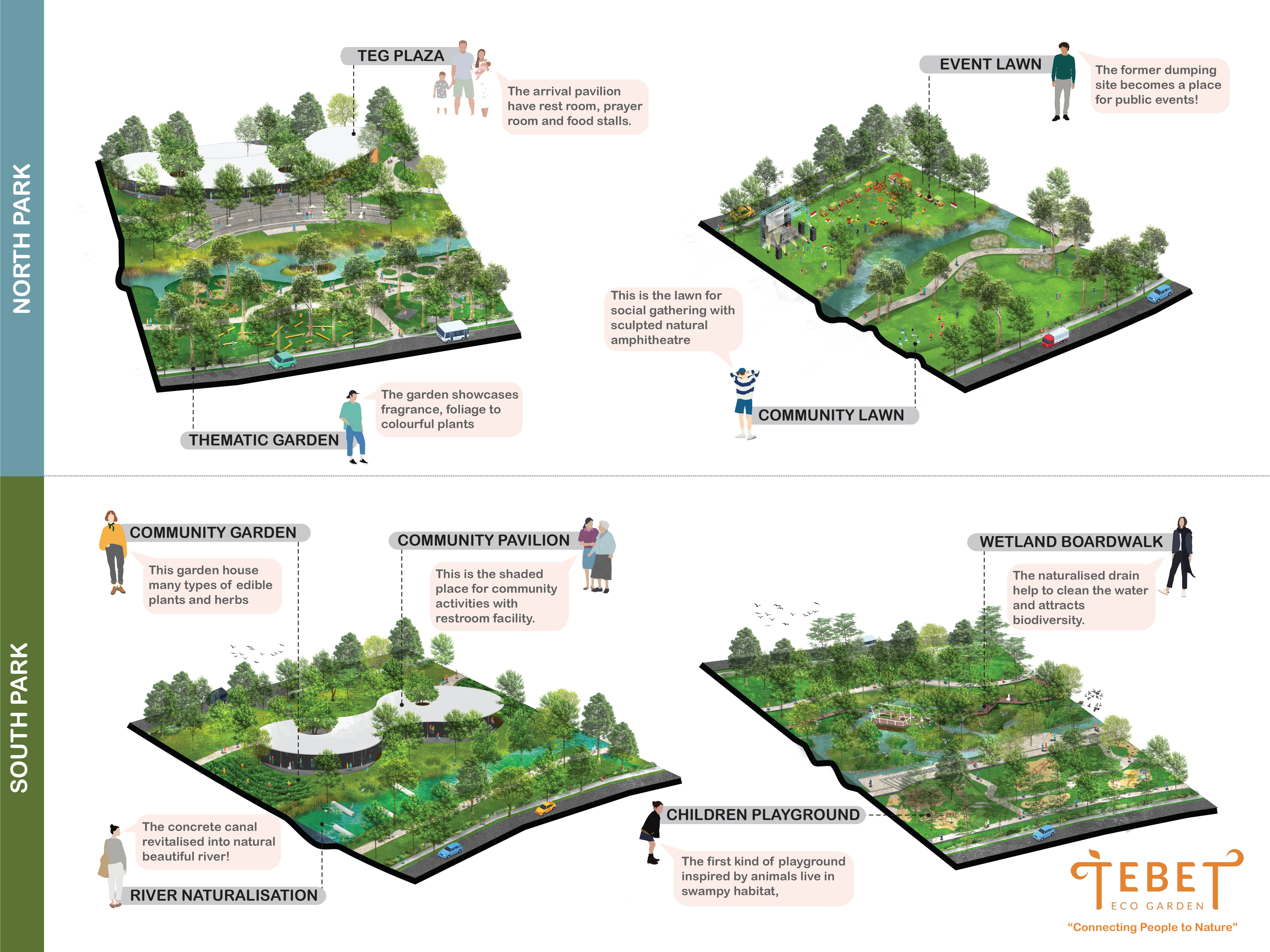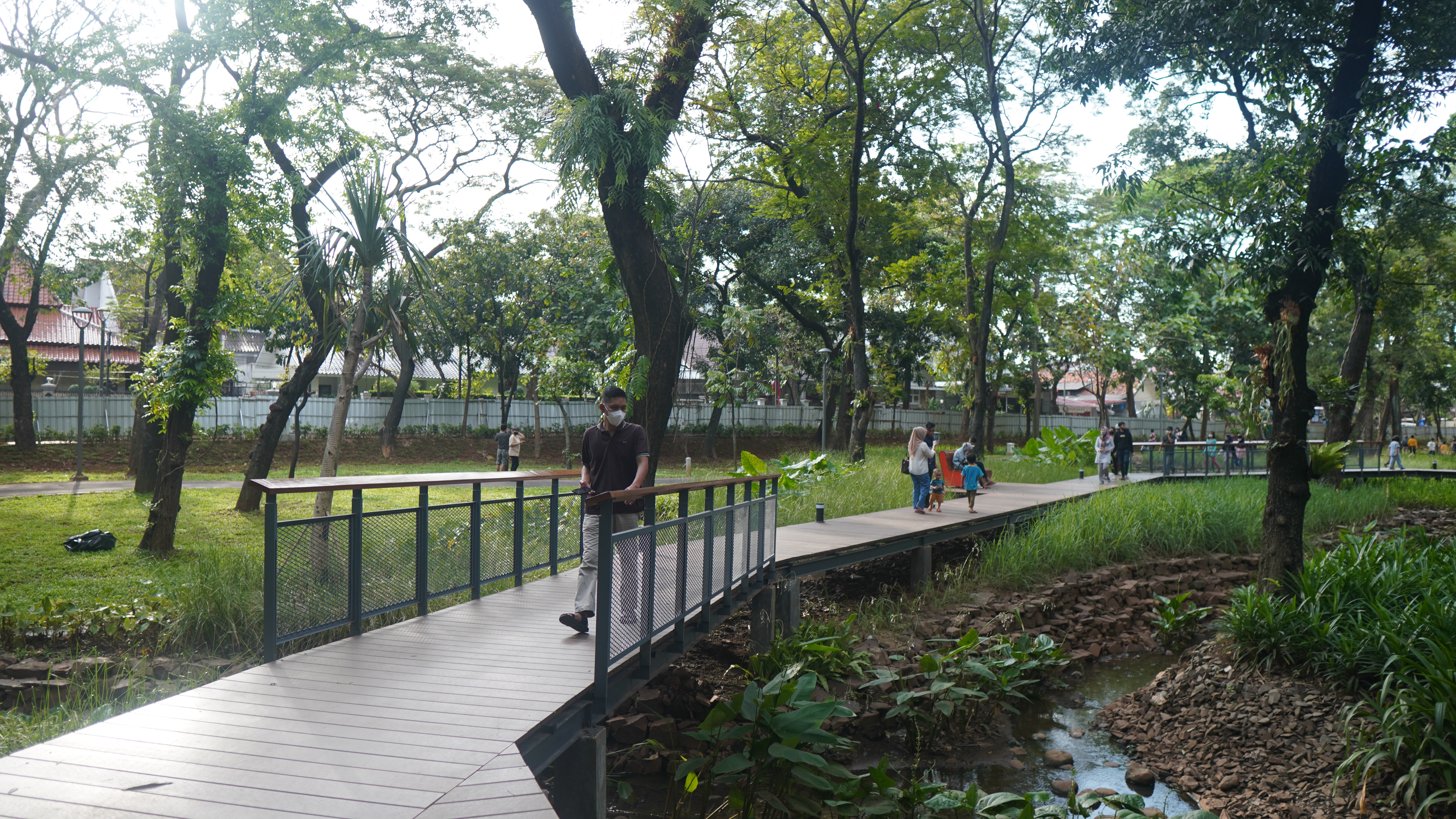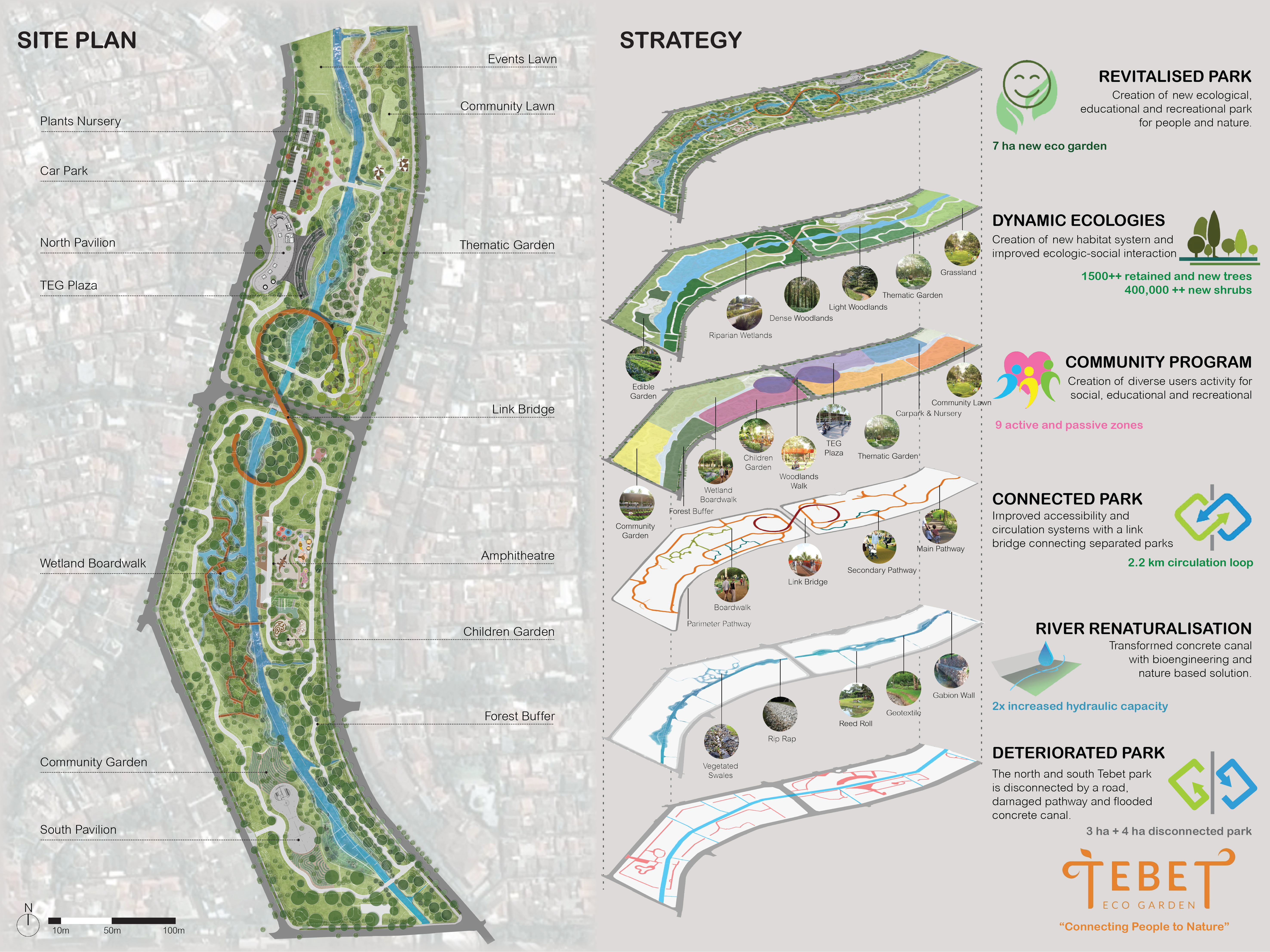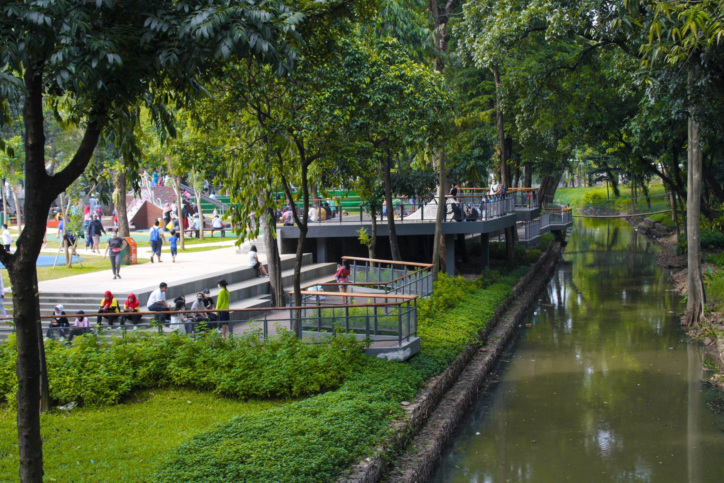 The Tebet Eco is a 7-hectare pilot public park project, located in South Jakarta in a densely populated area, focuses on an active restoration of the site’s ecology with tree conservation and planting; reduces the risk of flooding with river re-naturalisation; and cultivates an inclusive environment that facilitates access to a wide offering of educational programming and recreational activities, in order to provide maximum benefits for park users and the surrounding natural habitats and species. New active and passive park zones will also be incorporated into the space to complement the ecologically restored waterway and lush vegetation, with different connections inside and along the periphery of the park. Overall, this multi-government agency collaboration is more than just revitalising a park—it will