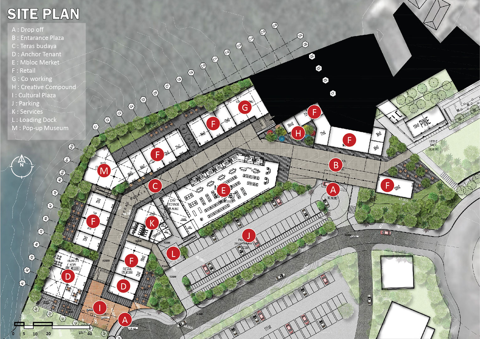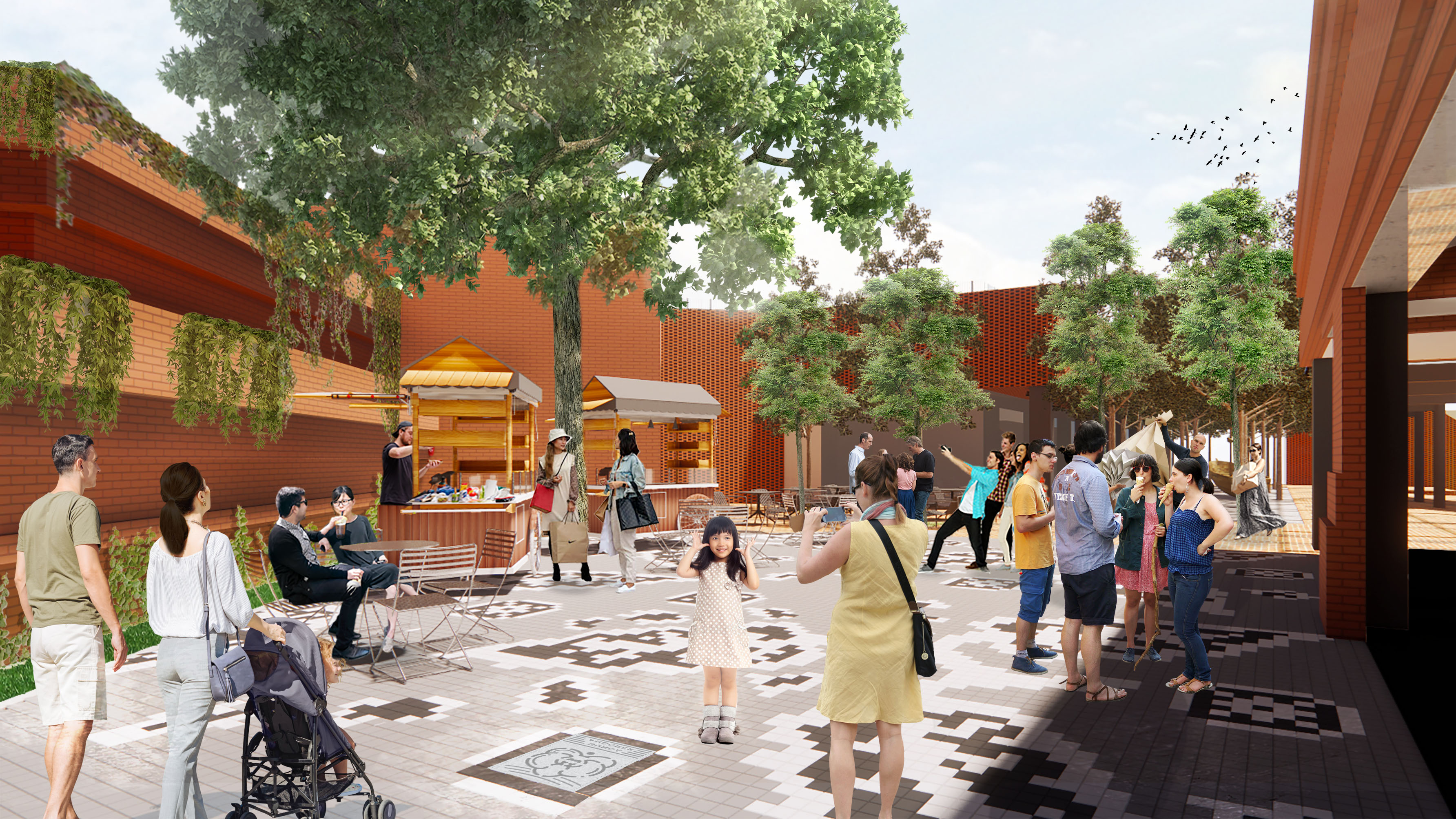 Teras Mendalo extension is a new destination in Jambi that includes Mbloc market as the extension of current existing F&B retail outlet. The landscape architecture design inspired by the natural and cultural legacy from Jambi city. The idea of the development is to provide vibrant outdoor destination for Visitors. The paving pattern is designed inspired by the local batik pattern. The river street with meandering pattern become a street sharing path mimicking the local Batang Hari river. All the site furniture will be upcycled from existing material for the sustainability effort